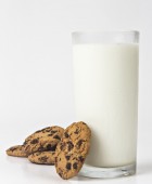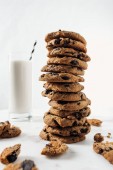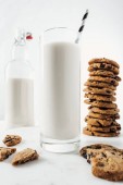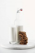 wegańskie mleko nerkowca w szkle i butelce w pobliżu czekoladowych ciasteczek na białym tle