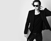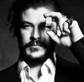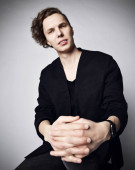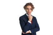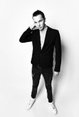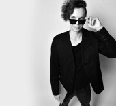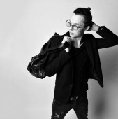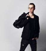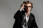 Młody stylowy człowiek z kreatywną fryzurą siedzi na wysokim krześle z okularem w ręku i powiedz nam coś