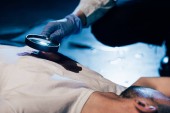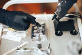 wykadrowany widok detektywa w rękawicach gumowych z zestawem dochodzeniowo-śledczym na scenie zbrodni