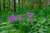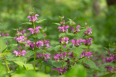 Ślepa Pokrzywa purpurowa na zielonym tle, w lesie.