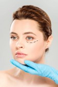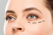 wykadrowany widok kobiety ze znakami na twarzy wyizolowane na szaro