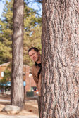 człowiek za pnia drzewa