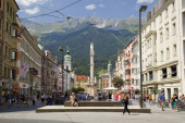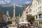 Widok Spitalskirche i kolumny św Anny z ulicy Marii Theresien, Innsbruck, Tyrol, Austria.