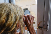 Syrakuzy, Sycylia, Włochy kobieta naprawia brwi pęsety w lustro.
