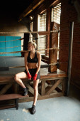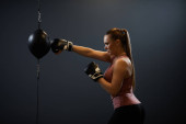 Dramatyczny portret widok z trudnych kobiet myśliwiec uderzając worek wykrawania w praktyce bokserskie, Kopiuj przestrzeń