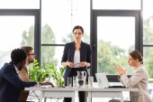 wieloetniczni biznesmeni przy stole z laptopami podczas konferencji w biurze