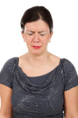 szczegół portret młodej kobiety robienie wyrażeniu pout, białe tło