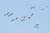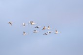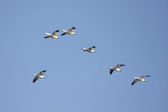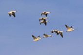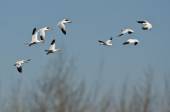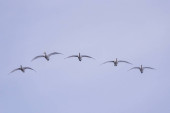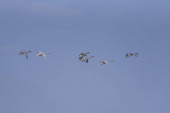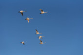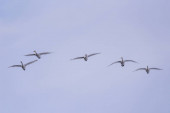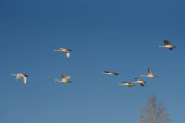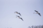 Grupa łabędzi latających nad jeziorem. "Lebedinyj" Łabędź natura R