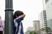 Wesoły Asian chłopiec mający zabawa blisko City ulica podczas rodzinny wycieczka do Down miasto