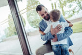 szczęśliwy ojciec obejmując syn na ulica w autumn dzień