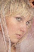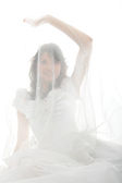 młoda kobieta macha przez lekkie tkaniny na biały high-key