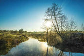 Słoneczny dzień, łąki i roślinność, Błękitne niebo. Rzeka peksha. Natura w lecie. Wieś aleksino w regionie Vladimir, Rosja