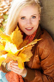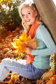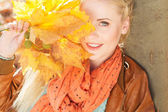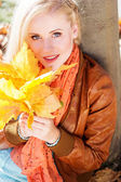 Szczęśliwy Ładna Blondynka teen ma na sobie sweter mody chodzenie w jesiennym parku z żółtymi liśćmi