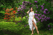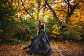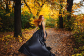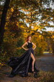 Zdjęcie "Kobieta spaceruje po parku o zachodzie słońca. Długi, czarny pociąg. " może być wykorzystywane do celów osobistych i komercyjnych zgodnie z warunkami zakupionej licencji Royalty-free. Obraz jest dostępny do pobrania w jakości wysokiej rozdzielczości do 5760x3840.