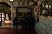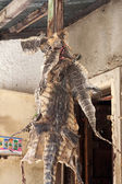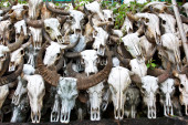 Pozostałości ofiar ze zwierząt zdobionych na filarach starożytnej świątyni Bagh Bhairav w Katmandu, Nepal.