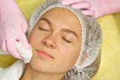 koncepcja kosmetyczka. Ręce kosmetologa umieścić krem na twarzy kobiety. Kosmetyczka nakłada krem na twarz dziewczyny.