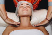 koncepcja kosmetyczka. Ręce kosmetologa umieścić krem na twarzy kobiety. Kosmetyczka nakłada krem na twarz dziewczyny.