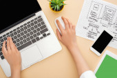 Zdjęcie "przycięty widok projektanta gospodarstwa strony internetowej szablon projektu w pobliżu gadżetów na żółtym tle" może być wykorzystywane do celów osobistych i komercyjnych zgodnie z warunkami zakupionej licencji Royalty-free. Obraz jest dostępny do pobrania w jakości wysokiej rozdzielczości do 5760x3840.