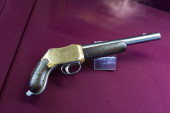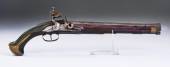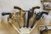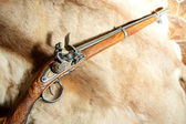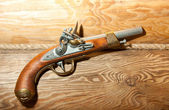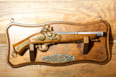 Stary pistolet krzemowy w muzeum zamkowym, starożytna broń, Europa. Tradycyjna architektura europejska, słynne miejsca turystyki i podróży, dziedzictwo historyczne