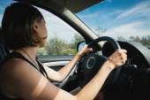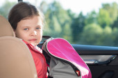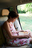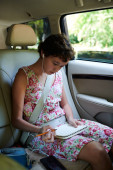 Przemyślany dziewczyna rysunek w szkicownik na tylnym siedzeniu samochodu