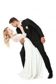 widok z boku pompatyczny mężczyzna i kobieta trzymając się za ręce podczas stojąc izolować don biały