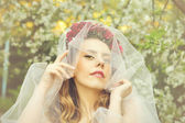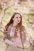 Kwitnąca wiosna rozprzestrzenia swój zapach wszędzie. Słodka dziewczyna w pelerynie stoi pod drzewem sakura