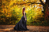 Jesienny krajobraz, dziewczyna spaceruje samotnie u podnóża gór pod jesiennymi liśćmi