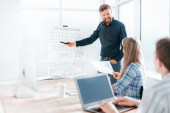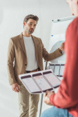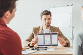 Selektywne skupienie się projektanta trzymającego układ aplikacji mobilnych ux z kolegami obok tablicy na tle