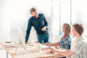 Selektywne skupienie się na uśmiechniętym projektancie pokazującym szkice ux mobilnej strony internetowej koledze w biurze