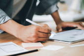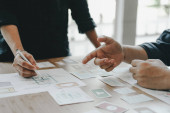 Zdjęcie "Widok projektanta ux pracującego z prototypem aplikacji mobilnej przy stole" może być wykorzystywane do celów osobistych i komercyjnych zgodnie z warunkami zakupionej licencji Royalty-free. Obraz jest dostępny do pobrania w jakości wysokiej rozdzielczości do 5760x3840.
