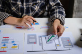 Zdjęcie "Przycięty widok ux projektant planuje projektowanie mobilnej strony internetowej z układami na stole" może być wykorzystywane do celów osobistych i komercyjnych zgodnie z warunkami zakupionej licencji Royalty-free. Obraz jest dostępny do pobrania w jakości wysokiej rozdzielczości do 5760x3840.