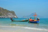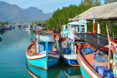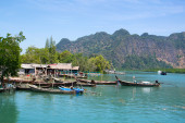 Zdjęcie "Kolorowe łodzie na rzece. Malowniczy krajobraz rzeki. Molo z pięknymi drewnianymi łodziami. Rzeka w górach w tropikach." może być wykorzystywane do celów osobistych i komercyjnych zgodnie z warunkami zakupionej licencji Royalty-free. Obraz jest dostępny do pobrania w jakości wysokiej rozdzielczości do 5760x3840.