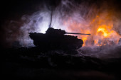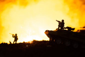 Zabawkarze z czołgiem, ogniem i zachodem słońca na czarnym tle, scena bitwy