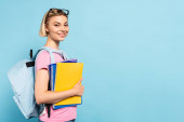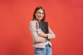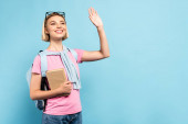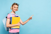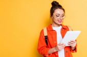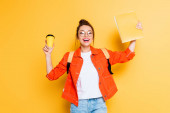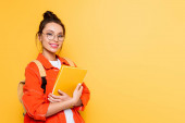 wesoły student trzymający notatnik i wskazujący palcem na żółtym tle