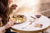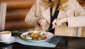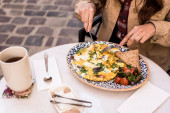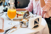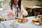 Widok kobiety wkładającej kostkę cukru do filiżanki herbaty w kawiarni