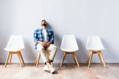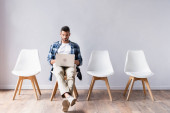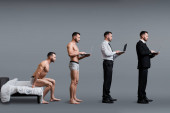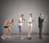 kolaż brodatego człowieka za pomocą laptopa w pobliżu ściany z cegły, koncepcja ewolucji