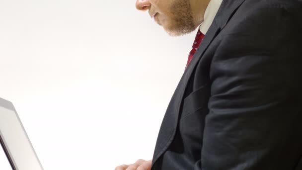 panoramiczne ujęcie biznesmena w garniturze wskazującego palcem na laptopa odizolowanego na szaro