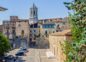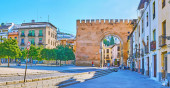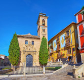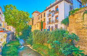 GRANADA, SPAIN - SEPTEMBER 25, 2019: Darro river is boardered with high banks and lined with such highlights of Albaicin as Santa Ana Church and Carrera del Darro street, on September 25 in Granada