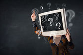 Biznesmen z głowicą monitora i znakami zapytania