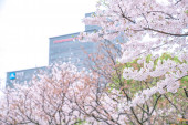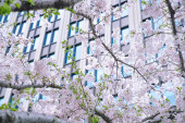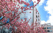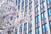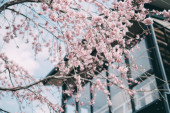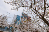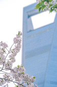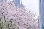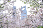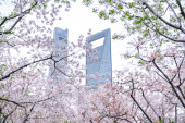 Kwiat wiśni na zielonej przestrzeni centrum finansowego Lujiazui w Szanghaju, Chiny