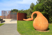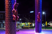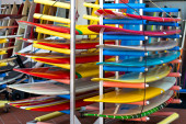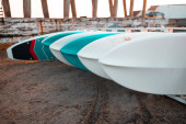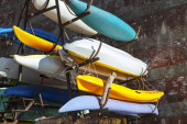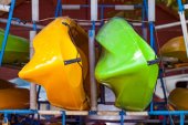Kolorowy rząd plastikowych kajaków, stojący pionowo wzdłuż ogrodzenia