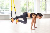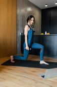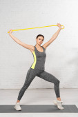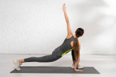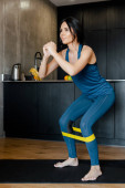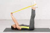 piękna wysportowana kobieta trenująca z opaską oporową na macie fitness w domu