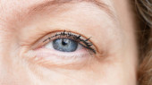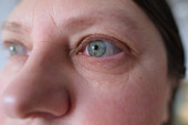 zielone oko z brązowymi plamkami na twarzy kobiety w podeszłym wieku, małe zmarszczki na powiekach, zwis, koncepcja związanych z wiekiem zmian w ludzkiej skórze