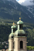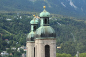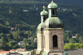 Widok z lotu ptaka na katedrę św. Jakuba (Dom zu St. Jakob, zbudowany w 1724 r.) pochodzącą ze szczytu Wieży Miejskiej (Stadtturm, 51 m), zbudowaną w 1450 r. w Innsbrucku, Tyrol w Austrii.
