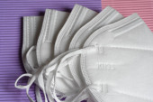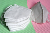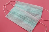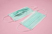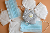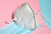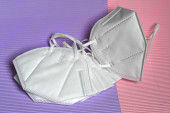 Szczegóły przeciwwirusowej maski medycznej do ochrony przed koronawirusem na kolorowym tle. Zapobieganie rozprzestrzenianiu się wirusa i pandemii COVID-19.