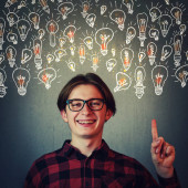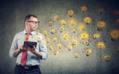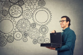 Biznesmen otwiera walizkę wypełnioną genialnymi pomysłami, gdy z pudełka wychodzą różne żarówki. Genialny szef pokazuje portfolio biznesowe, dzieli się kreatywnością i geniuszem z pracownikami