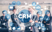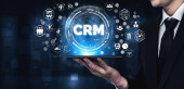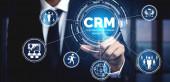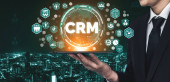 CRM Customer Relationship Management for business sales marketing system concept przedstawione w futurystycznym interfejsie graficznym aplikacji usługowej do obsługi analizy bazy danych CRM.