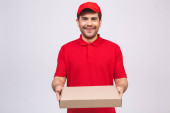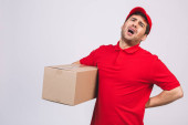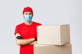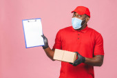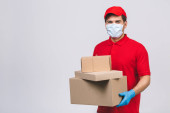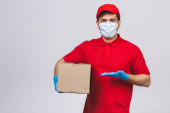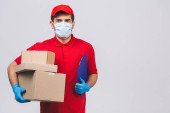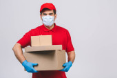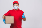 Dostawca pracownik w czerwonej czapce puste t-shirt jednolite rękawice maski twarzy trzymać puste pudełko kartonowe izolowane na białym tle. Koncepcja pandemii koronawirusa w służbie 2019-ncov.