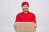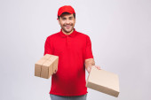 Zdjęcie "Dostawca pracownik w czerwonej czapce puste t-shirt jednolite rękawice maski twarzy trzymać puste pudełko kartonowe izolowane na białym tle. Koncepcja pandemii koronawirusa w służbie 2019-ncov." może być wykorzystywane do celów osobistych i komercyjnych zgodnie z warunkami zakupionej licencji Royalty-free. Obraz jest dostępny do pobrania w jakości wysokiej rozdzielczości do 5760x3840.