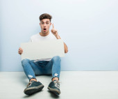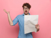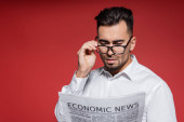 wyczerpany człowiek cierpiący na upał i używający gazet jako wentylatora ręcznego na żółto